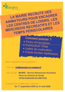 ♦ MODALITÉS D'INSCRIPTIONS Après la clôture des inscriptions toutes les demandes seront étudiées en fonction des places restantes et sera majoré de 10%. La fiche de renseignements de votre enfant est obligatoire. Il vous suffit de compléter les renseignements de votre famille sur l'espace personnel PORTAIL FAMILLE. Les informations seront prises en compte par notre référent portail famille qui vous enverra votre fiche actualisée à signer. Merci de la renvoyer sur portailfamille@sainghin-en-weppes.fr accompagnée de la copie du carnet de vaccination. ATTENTION aucune inscription ne pourra être prise en compte si le dossier n'est pas complet. |