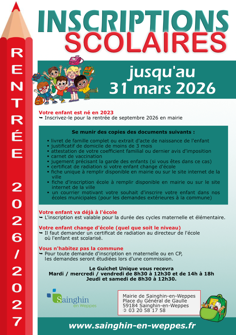 Inscription pour la rentrée scolaire 2026/2027 Vous pouvez retourner votre dossier d'inscription à l'adresse mail : portailfamille@sainghin-en-weppes.fr. |